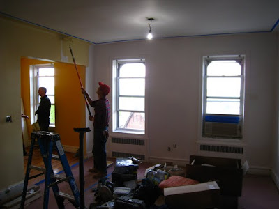 The lighting fixture installed, wall painted, floor sanded, stained, and polished.