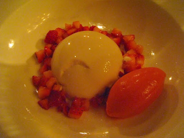 Almond milk panna cotta with sable breton: fresh strawberries, strawberry sorbet